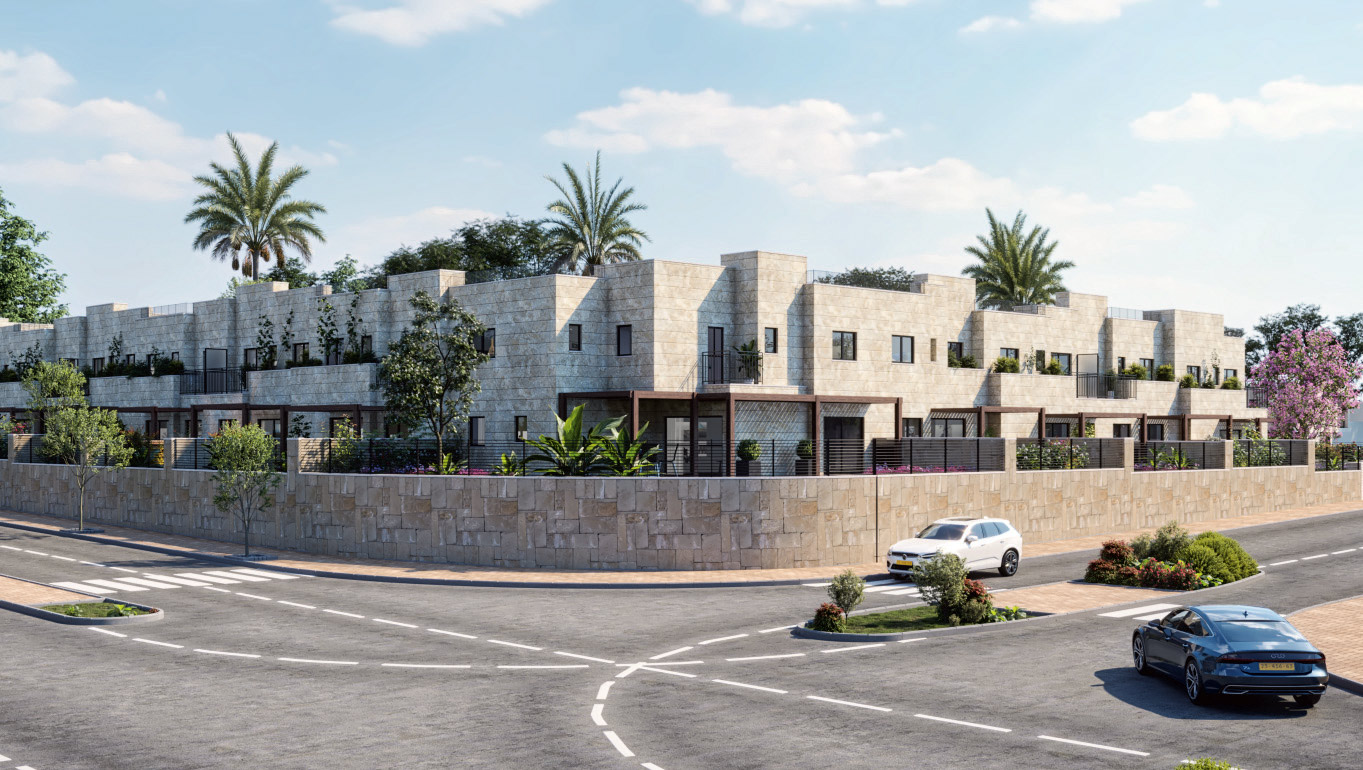 • חיפוי חיצוני באבן יוקרתית, בשילוב לוחות “משרבייה" וטיח.